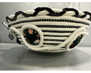 A Black and White Cotton Rope Basket adorned with loops of fl...