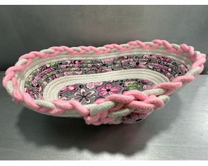 A White Cotton Rope Basket with a Pastel Pink Fabric Wrapping...